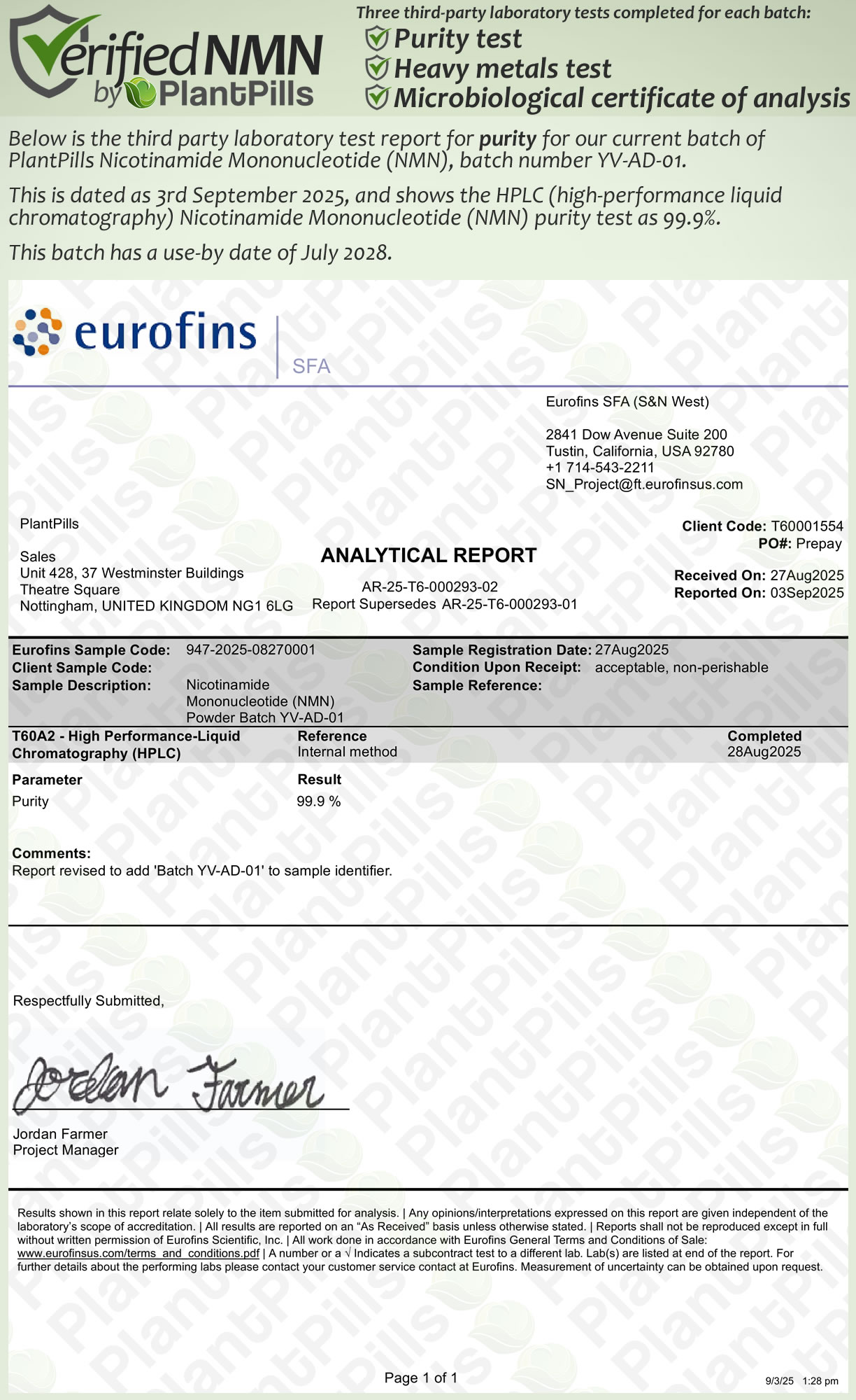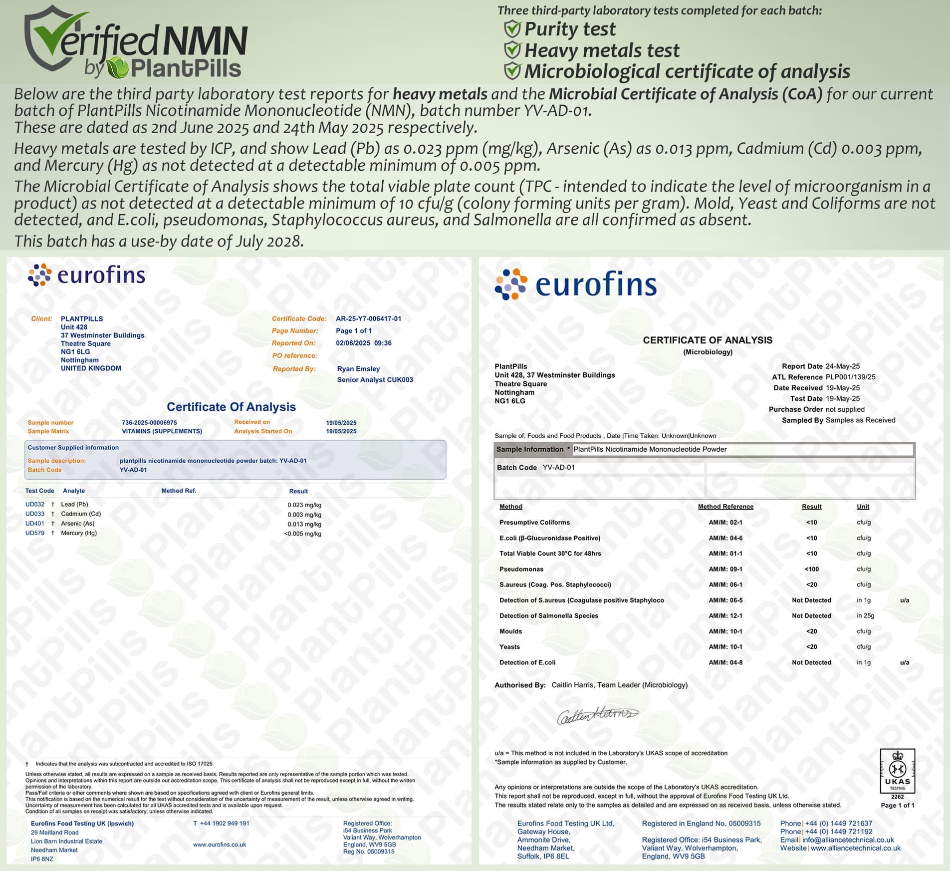 Above are the third party laboratory test reports for heavy metals and the Microbial Certificate of Analysis (CoA) for our current batch of PlantPills Nicotinamide Mononucleotide (NMN) , batch number YV-AD-01.